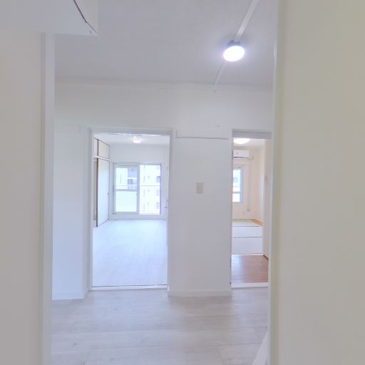動線と採光(確度72%):洗面所から廊下越しにリビング・キッチン方向へ抜けがあり、奥の居室に大きめの窓が見えるため日中の明るさが期待できる。