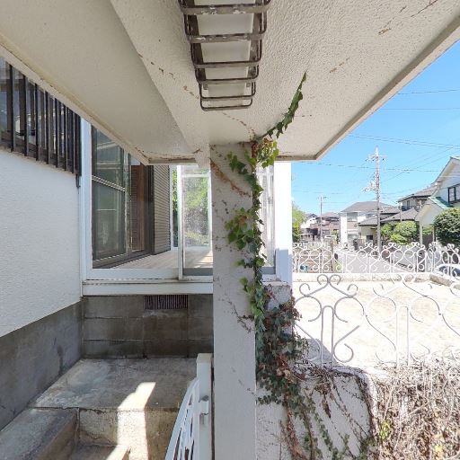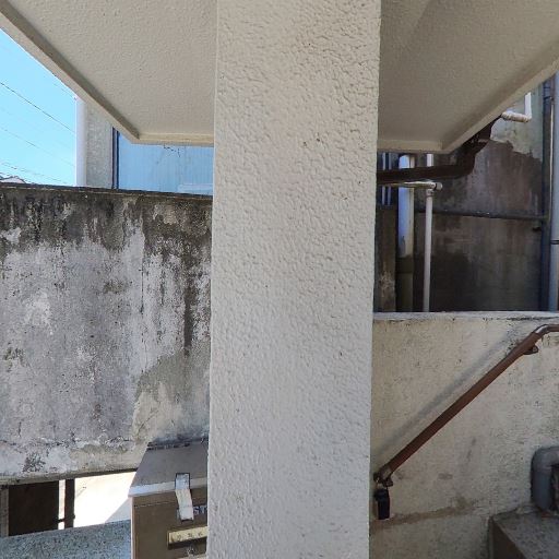 植栽・ツタの管理状況(確度74%):柱や塀にツタが伸びており、外壁に絡んでいる。