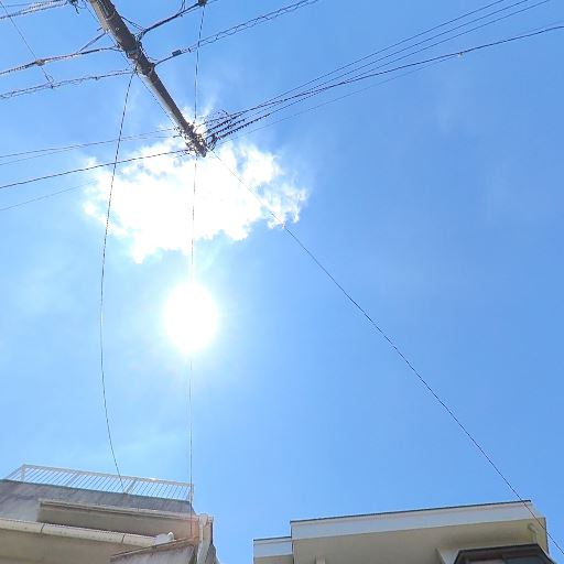 日当たりの良さ(確度70%):快晴時に直射日光がしっかり当たっており、建物の影も短いことから日照は良好と推測。