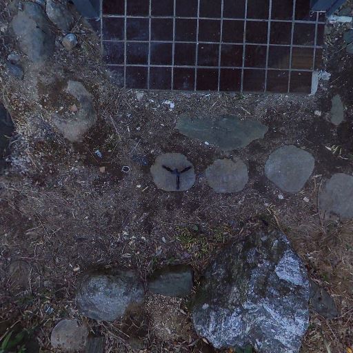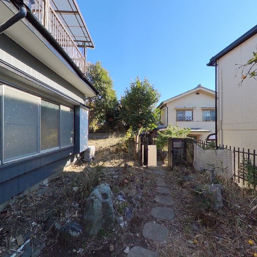 庭・アプローチの広さ(確度78%):家の前に土と石で構成された庭があり、飛び石で門側へ通路が続いている。植栽スペースも十分にある。