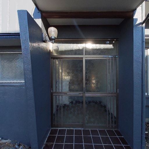 玄関ドアとポーチの状態(確度70%):引き戸の玄関は型ガラスで目隠しされ、上部に照明もある。枠や床タイルは年代を感じるが大きな破損は見当たらない。