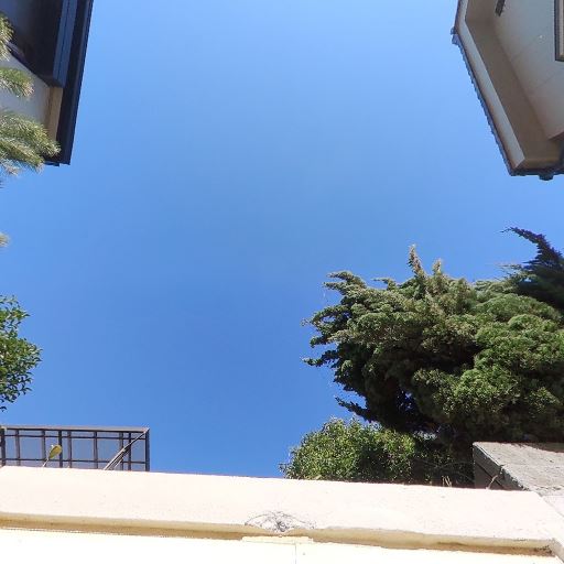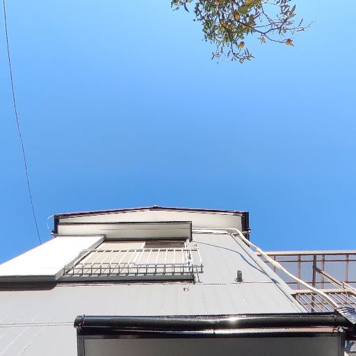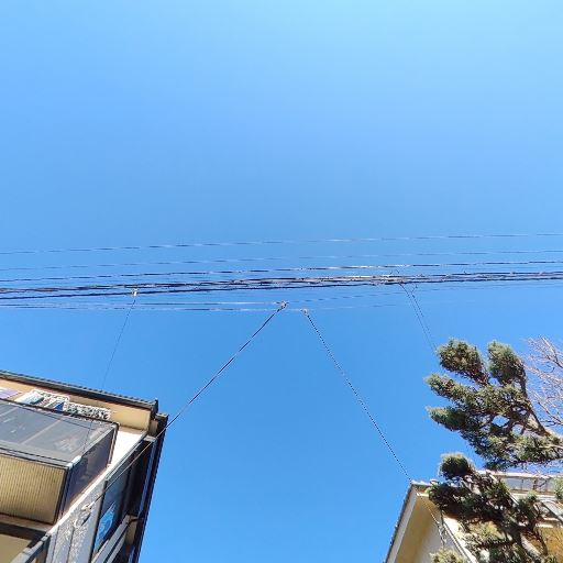日当たり(確度78%):強い直射日光が差し込んでおり、青空が大きく抜けている。周囲の建物はあるが空が見える抜けがある。