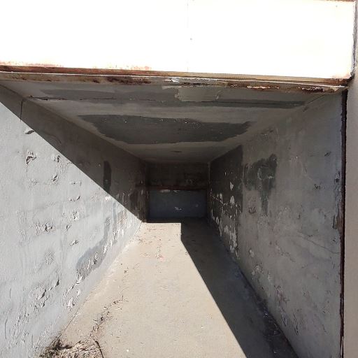 通路・ガレージのような空間(確度86%):コンクリートの天井と壁に囲まれた細長い通路(または半地下ガレージの奥行き)が見える。壁面は劣化やはがれが所々あり、暗がりができている。