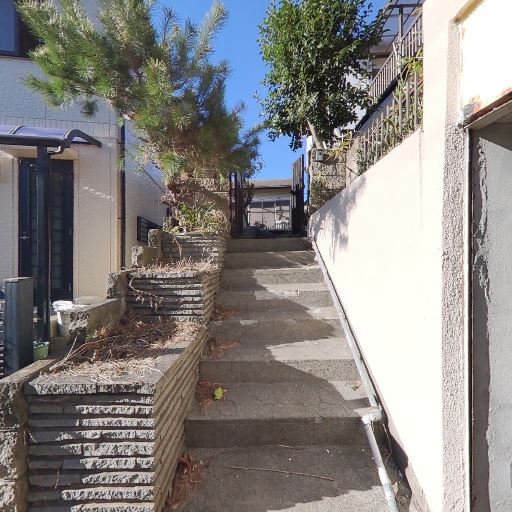アプローチの階段(確度84%):敷地へ上がる階段があり、左右に植栽スペース。段差は複数段で手すりは見当たらない。