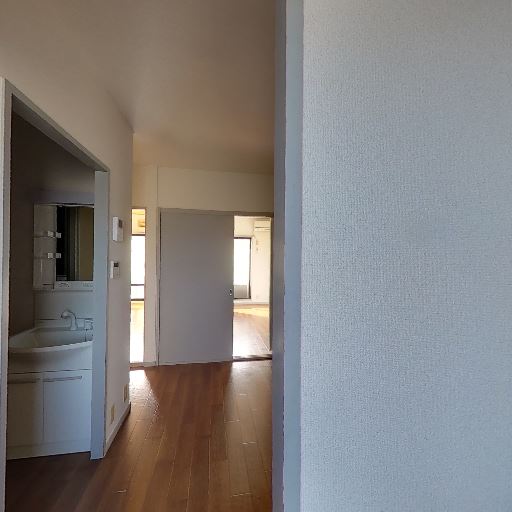 • 室内への導線(確度73%):玄関からまっすぐ先に洗面台と居室が見え、フローリングの廊下でつながっている。