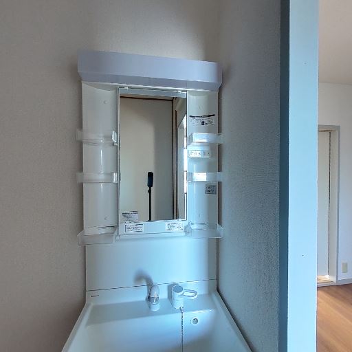 • 洗面台と収納付きミラー(確度86%):廊下側に独立洗面台とミラーキャビネットが確認できる。