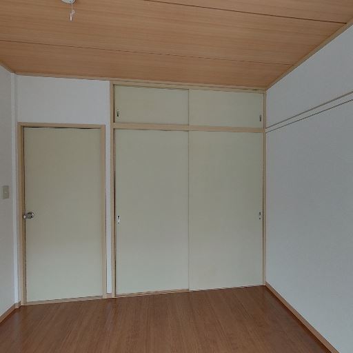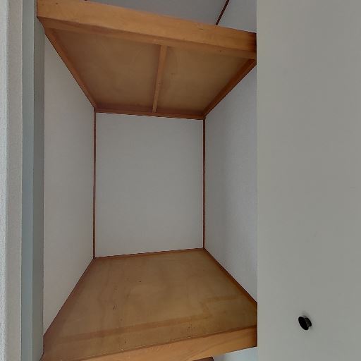 • 和風収納(押入れ)(確度82%):木枠と棚板のある奥行きの深い収納スペースが見える。上下段で布団や大きめの荷物を入れられそう。
