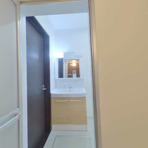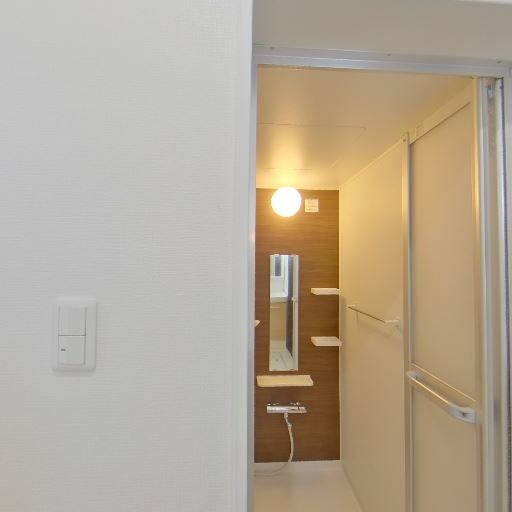 独立洗面室に直結(確度86%):浴室の引き戸の先に独立洗面台と脱衣スペースが見える。