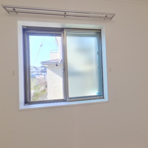 小窓と採光(確度80%):左壁面に横引きの窓があり、外の景色と直射日光が入っている。すりガラス側もあり、視線配慮がされている。