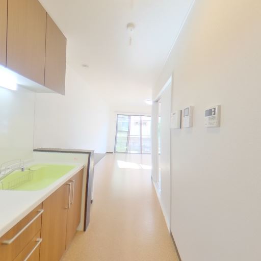 床材とコンセント位置(確度69%):クッションフロア系の床材で、キッチン足元中央付近にコンセント差し込みが見える。