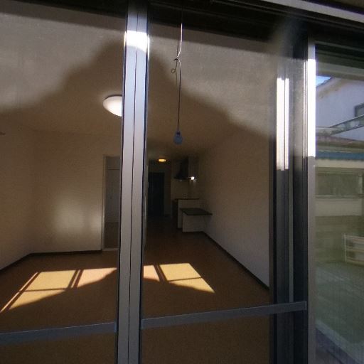 日当たり・採光(確度86%):バルコニー(専用庭スペース)にしっかり直射日光が当たっており、室内床にも日差しの影が伸びている。