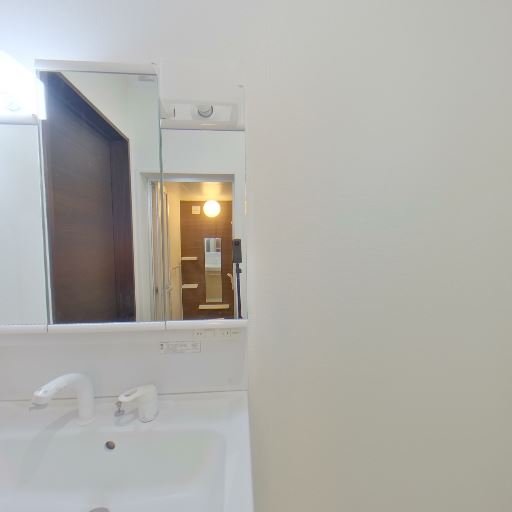 独立洗面台と収納付きミラー(確度86%):洗面ボウルとシングルレバー水栓、ミラーキャビネットが設置されている。ミラーの側面に収納棚が見える。