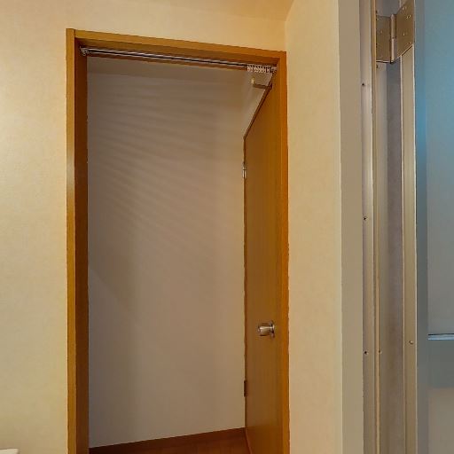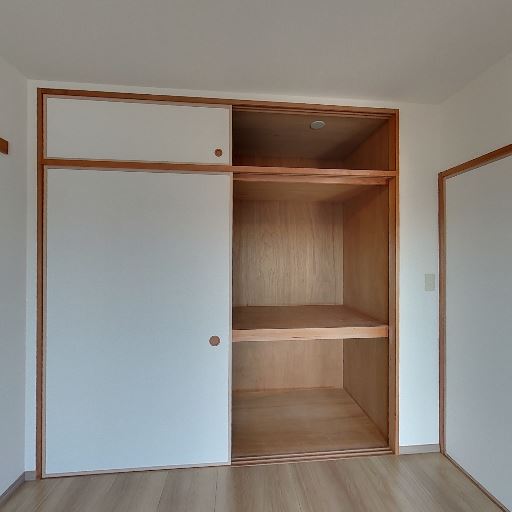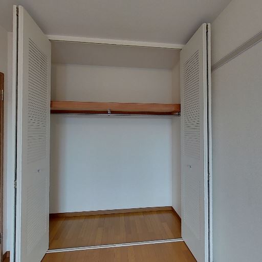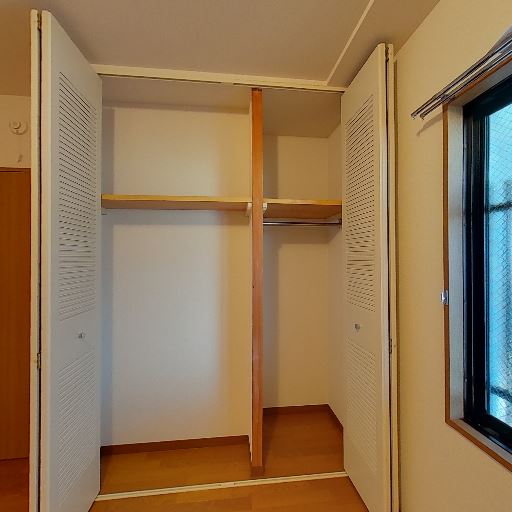 • 大きめのクローゼット(確度90%):観音開きの扉付きで中にハンガーパイプと上段棚があり、左右に分かれた収納量が確保されている。