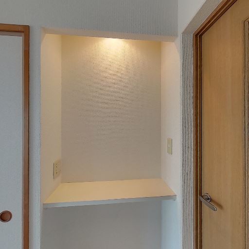 • ニッチカウンターと照明(確度82%):壁のくぼみにダウンライト付きのニッチカウンターがある。コンセントもあり、ルーターや飾り棚として使えそう。