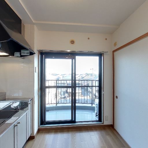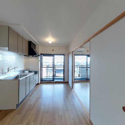 • LDKのバルコニー面採光とキッチン(確度86%):キッチンと横並びの細長いLDK。突き当たりに大きな掃き出し窓が2面あり、バルコニーに面している。