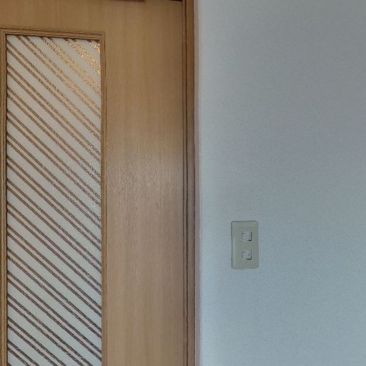 • 引き戸付きの居室導線(確度73%):すりガラスの縦長窓が入った木目の引き戸が見える。