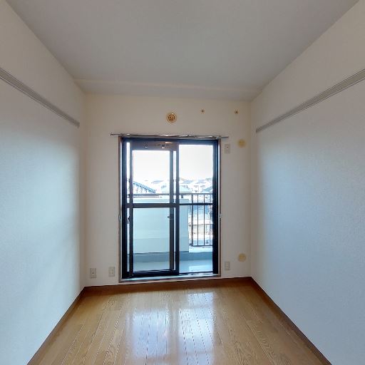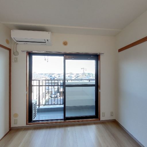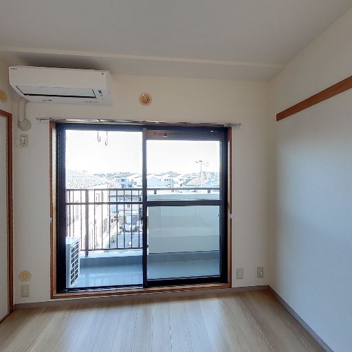 • バルコニーとエアコン設置済み(確度90%):掃き出し窓の先にバルコニーが見え、室内にエアコンが設置されている。