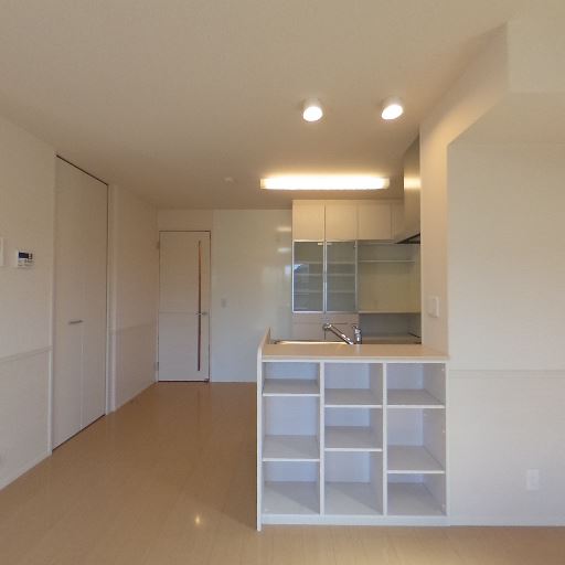 対面キッチンと収納棚で機能性が高そう(確度90%):back画像にカウンター付きの対面キッチンと、下部のオープン棚が見える。調理中も室内を見渡しやすく、収納やディスプレイにも使えそうである。