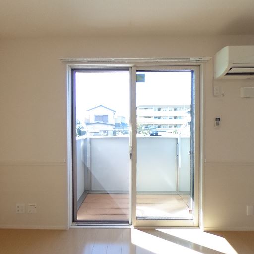 バルコニーに面した掃き出し窓がある(確度90%):前面に大きな引き違い窓があり、その先にバルコニー床と手すりが確認できる。洗濯物干しや換気のしやすさが見込める。