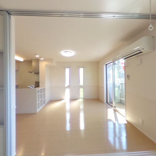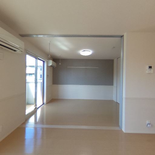 自然光が入りやすい明るい室内(確度92%):掃き出し窓があり、室内全体に強い自然光が差し込んでいる。隣接空間側にも光が届いており、日中の明るさは期待できる。