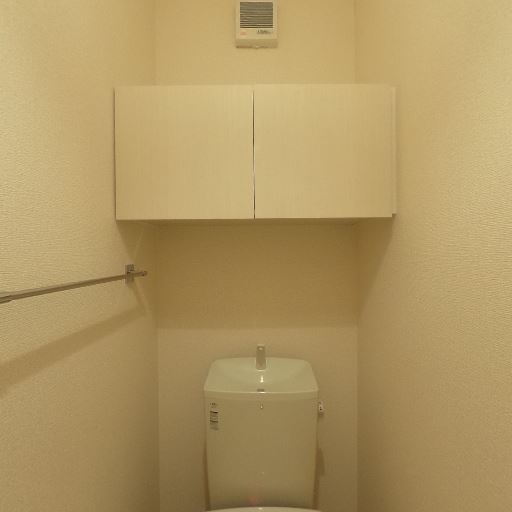 上部収納が設置されている(確度94%):トイレ上部に扉付きの収納棚があり、トイレットペーパーや掃除用品の収納に使えそうである。