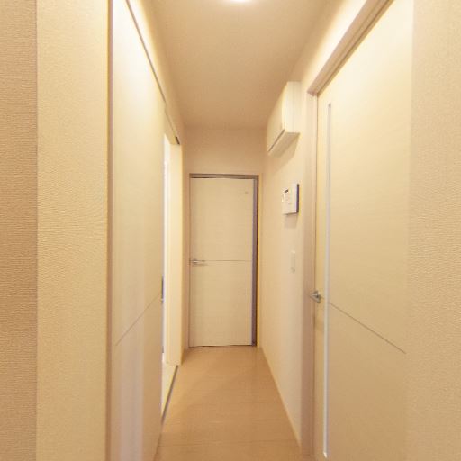 玄関〜廊下が明るく清潔感がある(確度89%):天井照明により玄関から廊下にかけて十分な明るさが確保され、壁・建具・床も淡い色味で統一されているため、全体として清潔感のある印象を受ける。