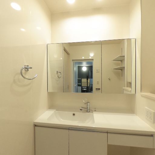 洗面台が広く三面鏡で使いやすそう(確度93%):洗面ボウルまわりに十分なカウンター幅があり、三面鏡タイプの収納付き洗面台が設置されている。身支度や小物整理のしやすさが期待できる。