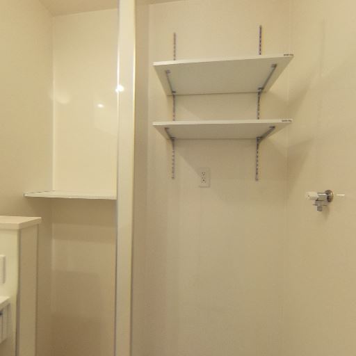 洗濯機置き場に可動棚があり収納性が高い(確度95%):洗濯機置き場と思われるスペースの上部に可動棚が2段あり、洗剤やタオル類を置ける構成になっている。コンセントも確認できる。