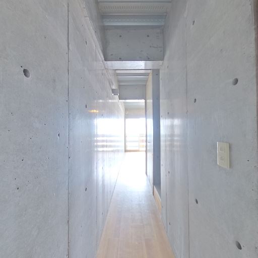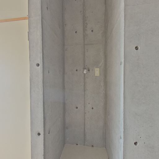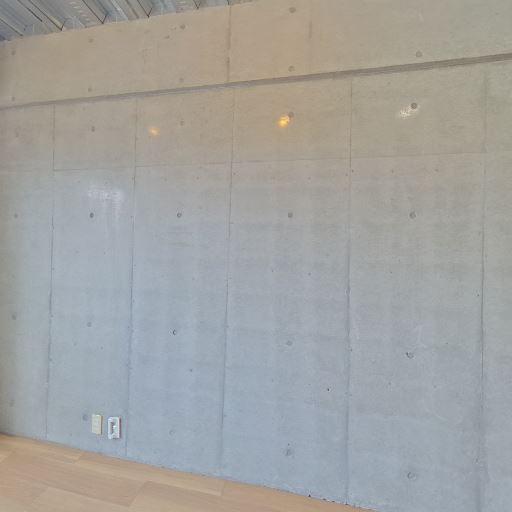 打ちっぱなしコンクリートの内装(確度86%):壁が全面コンクリート打放しで、丸形のセパ穴が見える。無機質でスタイリッシュな印象。
