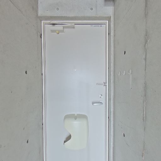 玄関ドアと土間の状態(確度78%):白い玄関ドアは目立つ傷や凹みがなく、ドアポケット付き。土間はコンクリートで清潔に見える。