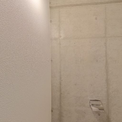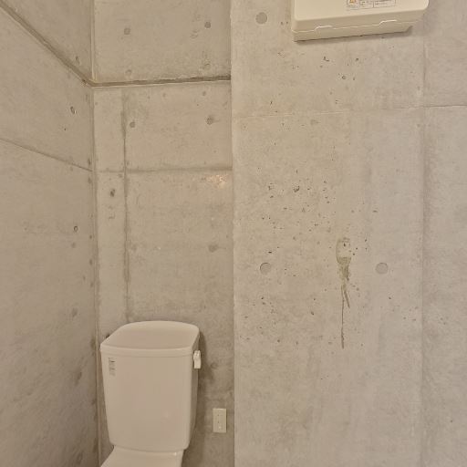 打ちっぱなしコンクリートのトイレ空間(確度78%):壁がコンクリート打放しでスタイリッシュな印象。ペーパーホルダーや換気口など設備はシンプル。