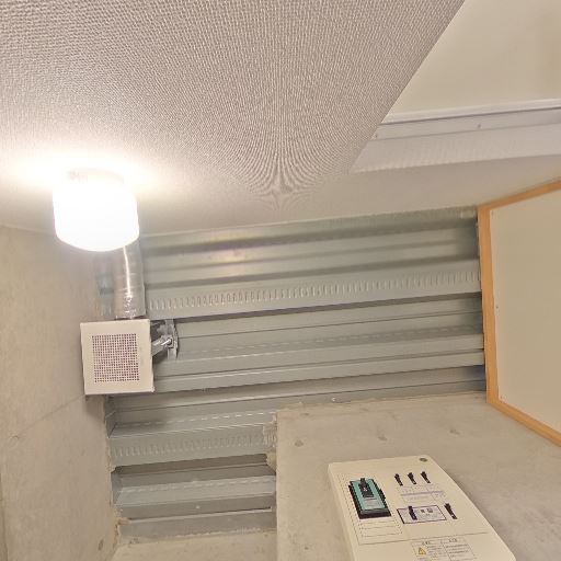 ブレーカーや配管が露出する天井(確度77%):天井にブレーカーパネルや金属デッキが見え、設備が露出している。
