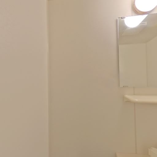 鏡と小棚があり身支度は可能(確度84%):洗面横に鏡とトレイ棚、上部に照明がある。