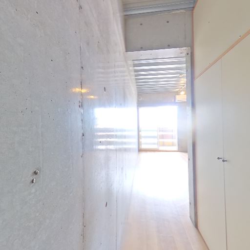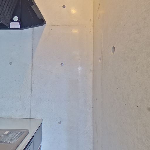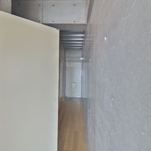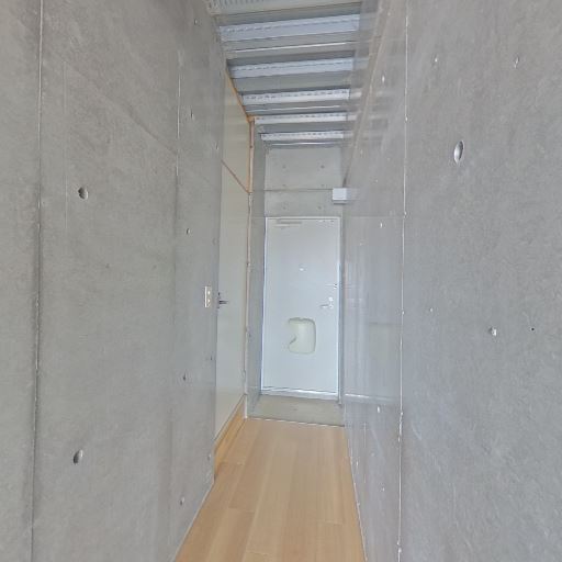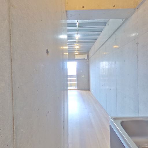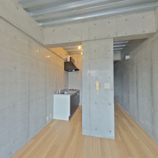 コンクリート打ちっぱなしの内装(確度90%):壁と天井がコンクリート仕上げで、ボルト跡や目地が見える。無機質でスタイリッシュな印象。