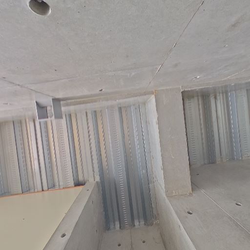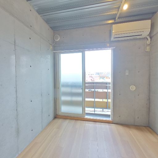 コンクリート打ちっぱなしの内装(確度90%):壁・天井がコンクリート仕上げで、天井はデッキプレートが露出している。