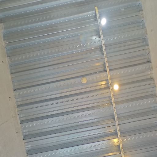 天井の金属デッキと配管スペース(確度70%):金属デッキプレートの天井が見え、躯体あらわし。照明・配線は露出施工の可能性。