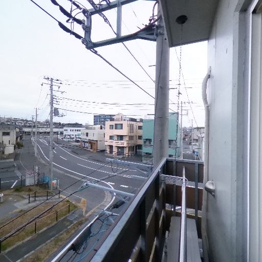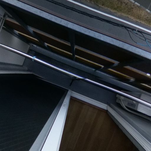 バルコニーあり・物干しスペース(確度90%):細長いバルコニーに手すりと物干し金具、物干し竿が確認できる。