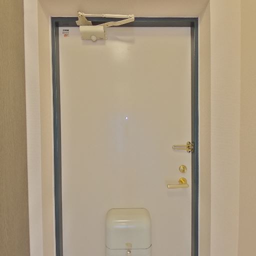 • 玄関ドアと設備(確度78%):スチールドアにドアクローザー・ドアチェーン・ダブルロック、下部にシューズボックス一体型のような郵便受け/傘立て風カバーが見える。防犯と使い勝手は標準的。