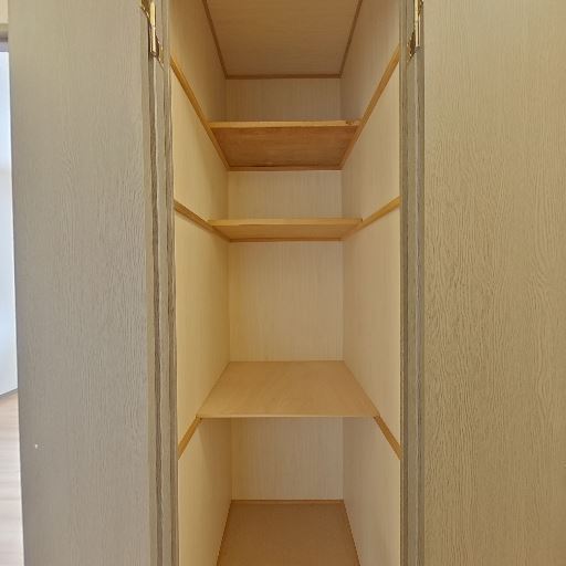 • 廊下に面した物入れ(可動棚)(確度86%):扉付きの収納スペースに棚が複数段あり、日用品やリネン類を整理しやすい構成。棚は高さ違いで使い分けできそう。