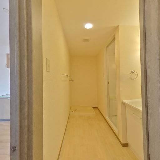 • 洗面脱衣所の広さと設備(確度82%):洗濯機置き場と独立洗面台、奥に浴室がある。床・壁ともに明るい内装で清潔感がある。