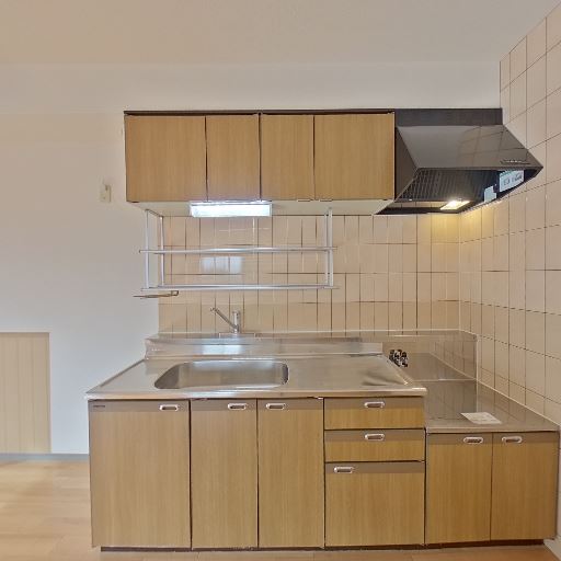 • キッチン設備の充実(確度86%):ガスコンロ台、ステンレス天板・シンク、吊戸棚とオープンラック、レンジフードが確認できる。