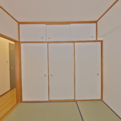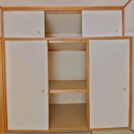• 押入れと天袋つきの収納(確度90%):和室に引き戸の押入れがあり、中段と下段、上部に天袋がある。布団や季節物を整理して置ける容量がある。