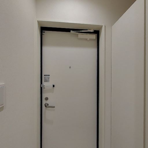 玄関ドアと共用部側の防犯性(確度78%):ドアクローザー・ドアスコープ・内側サムターン、メール受け口が確認できる。