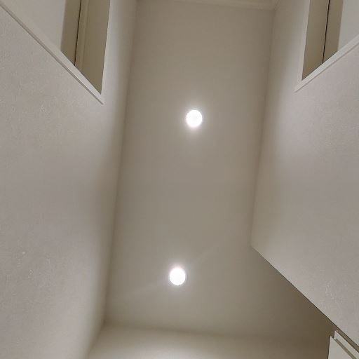 採光は弱く照明前提の空間(確度86%):窓は見当たらず、天井のダウンライト2灯で明るさを確保している。