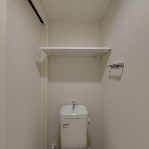 トイレに収納棚あり(確度90%):便器後方の上部にシンプルな一枚棚が設置されており、トイレットペーパーや掃除道具を置ける。