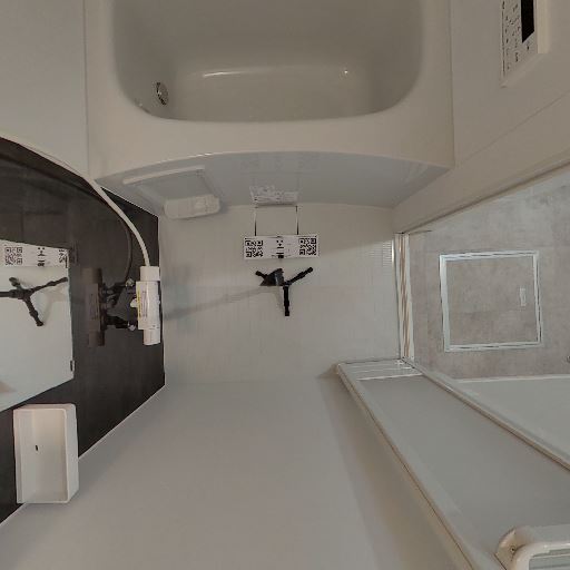 清潔感のあるユニットバス(確度78%):白を基調にダークパネルのアクセントで新しめ。カビや汚れは目立たない。