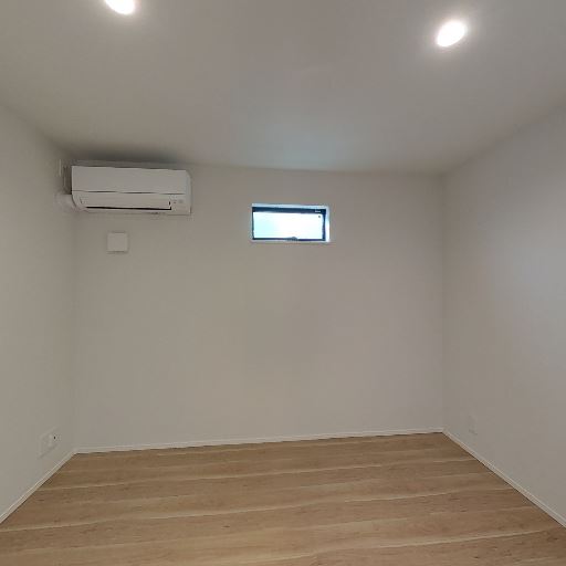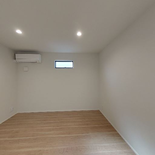 個室側は高窓でプライバシー配慮(確度72%):奥の部屋は横長の高窓で外からの視線を避けつつ採光。ダウンライト照明も複数あり。