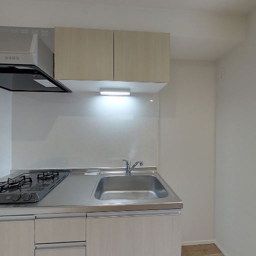 コンパクトなキッチン設備(確度83%):2口ガスコンロ、上部吊戸棚、シンクがあり、単身〜二人暮らし向けのサイズ感。コンロ横に作業スペースはやや狭め。