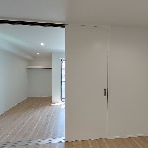 可動間仕切りで1LDK風に使える(確度86%):リビングと奥の部屋が引き戸で仕切られており、開閉で空間の一体化・分割が可能。