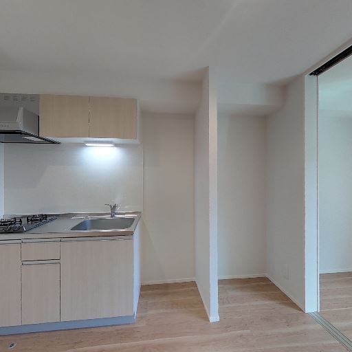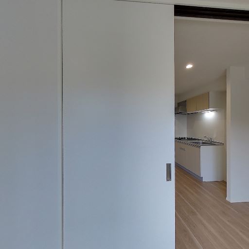 キッチンと隣接する引き戸(確度80%):引き戸の先にシステムキッチンが見え、空間が連続している。